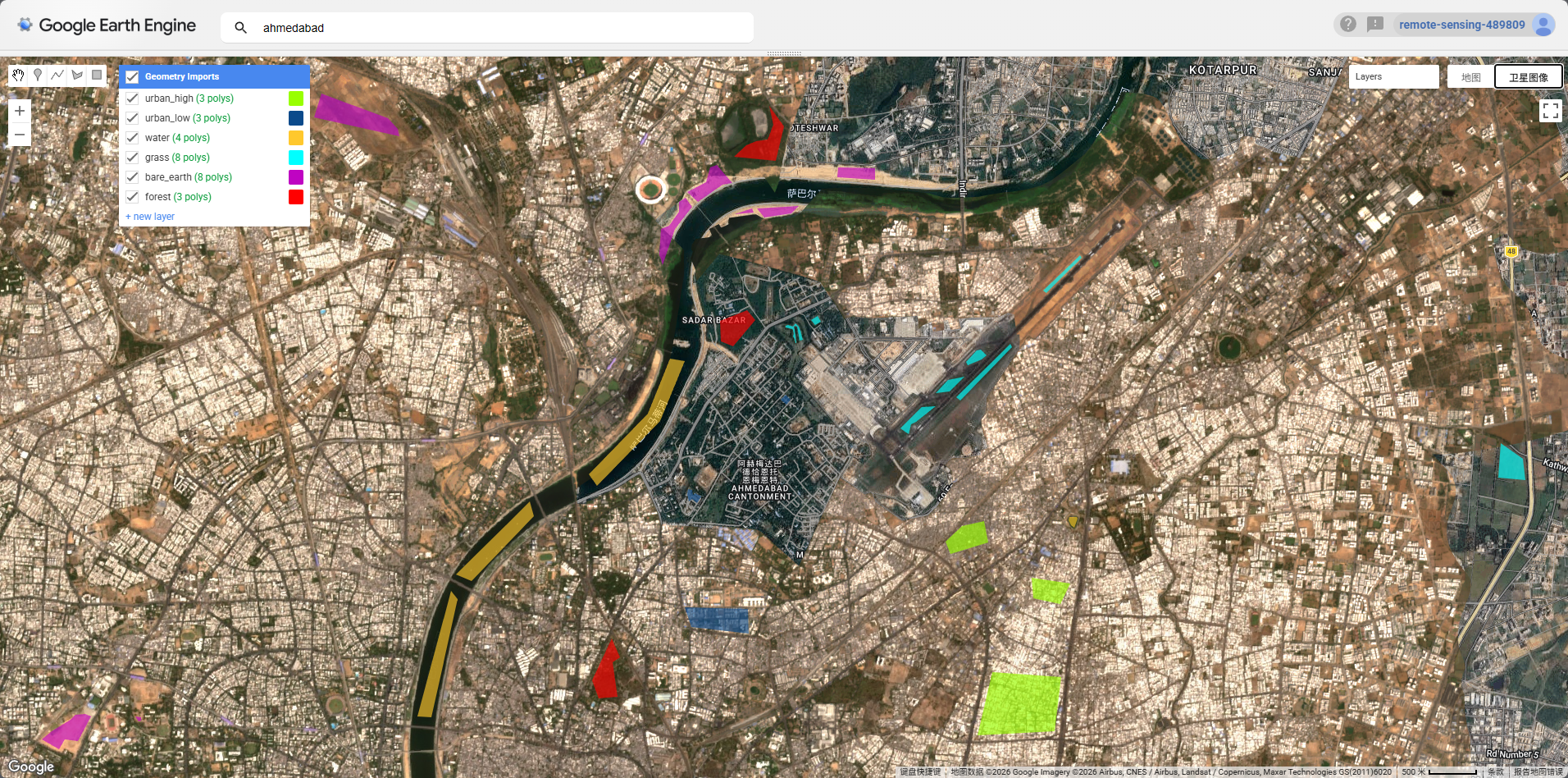 For the practical, I loaded Sentinel-2 SR Harmonized imagery (2022, <20% cloud cover per tile) with a QA60 bitmask cloud mask applied at the pixel level. After clipping to the AMC boundary, I manually digitised training polygons for six land cover classes: high-density urban, low-density urban, water, grass, bare earth, and forest.
