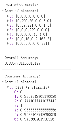 The confusion matrix reveals that water achieved 100% consumer accuracy, forest 97.4%, and grass 95.6% — all spectrally distinct classes. The main source of confusion was between high- and low-density urban (classes 1 and 2), which is expected given their similar spectral signatures in the visible and NIR bands.