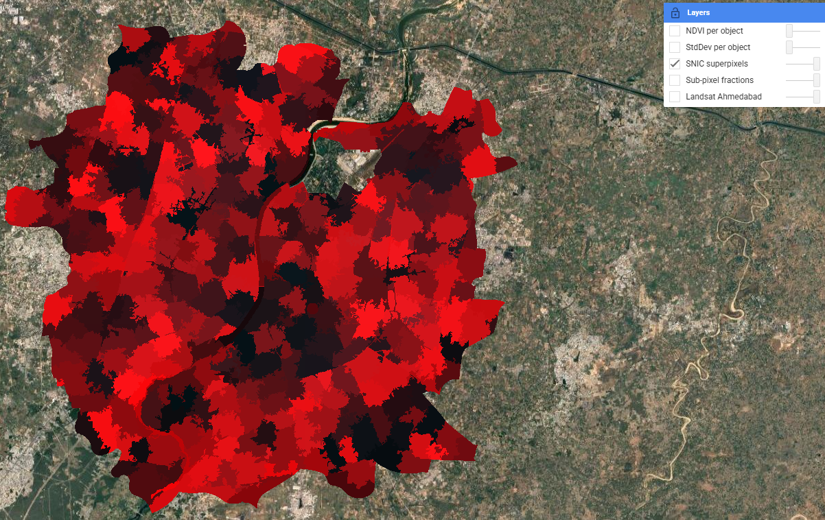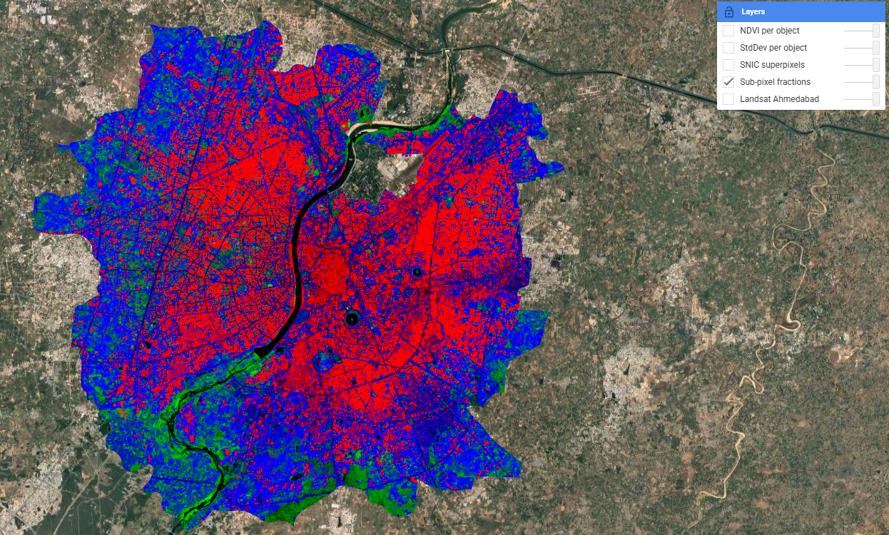 Spectral unmixing defines spectrally pure endmembers for each land cover class and computes the fractional contribution of each to every pixel. In GEE this is implemented via .unmix(), with constrained outputs ensuring fractions sum to 1. The result is a smooth, continuous surface — in contrast to the hard boundaries produced by Random Forest last week. The Sabarmati River appears as a clean black corridor, reflecting near-zero contributions from all non-water endmembers.