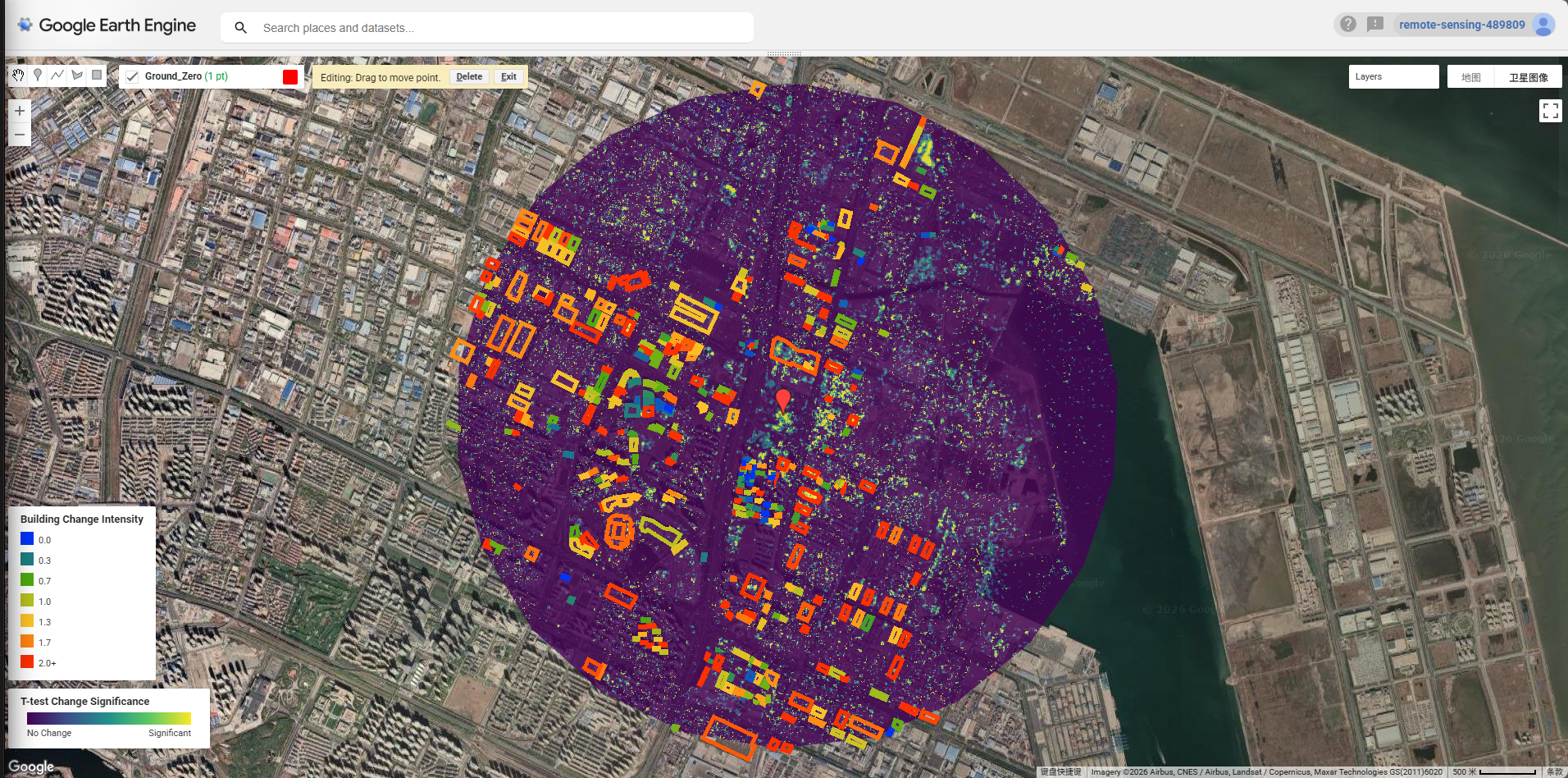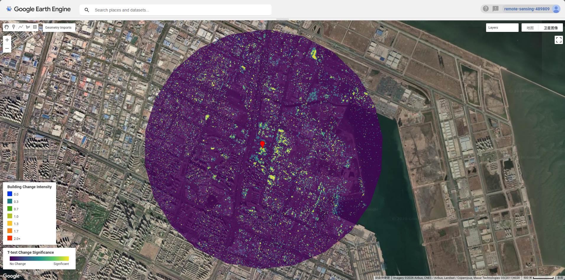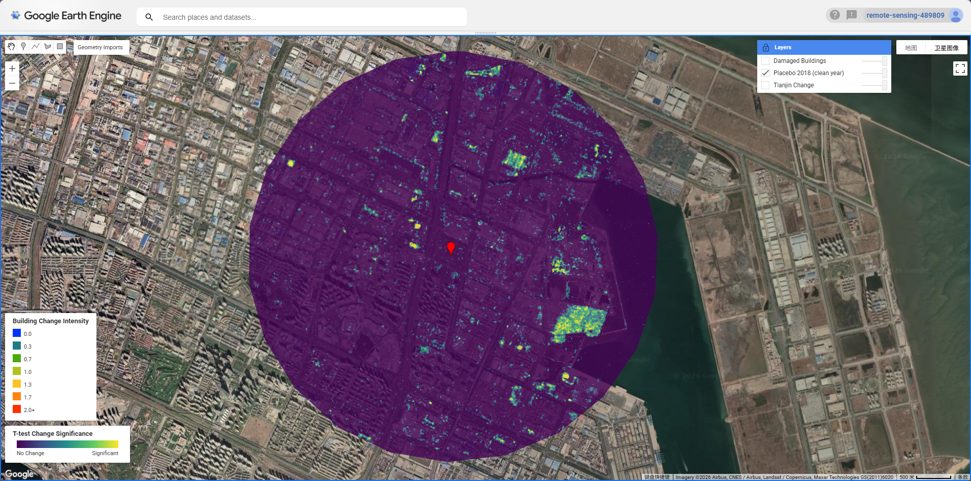 OSM building footprints were extracted via Overpass Turbo for the wider Tianjin Binhai area and uploaded to GEE as my user asset (projects/remote-sensing-489809/assets/Tianjin). The reduceRegions() function was used to compute mean t-test scores within each building polygon, identifying structures with statistically significant change (mean > 0).